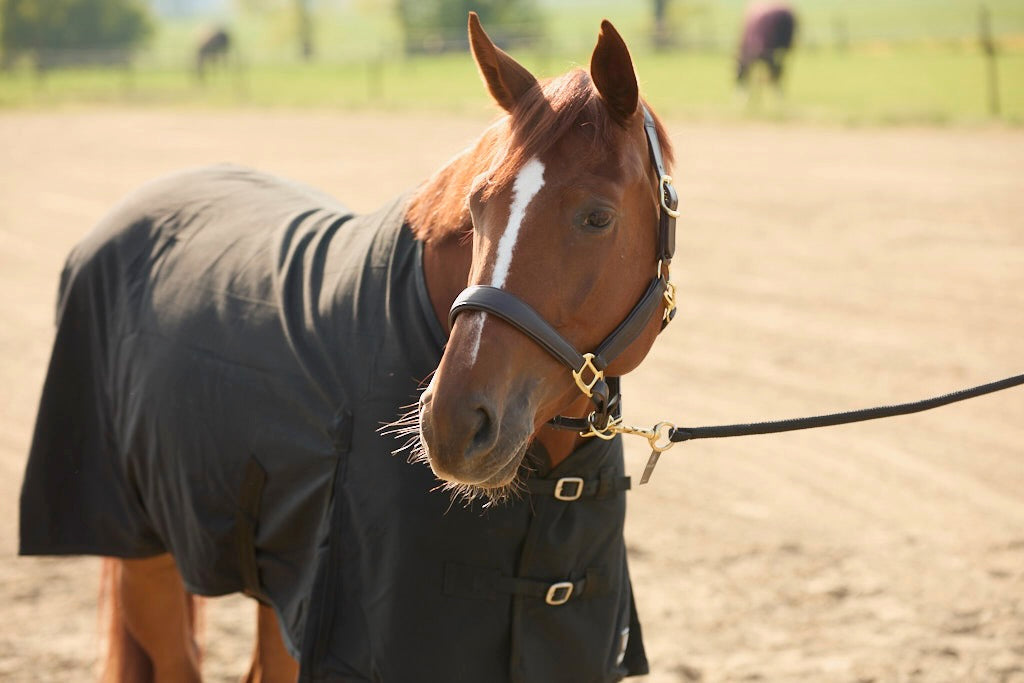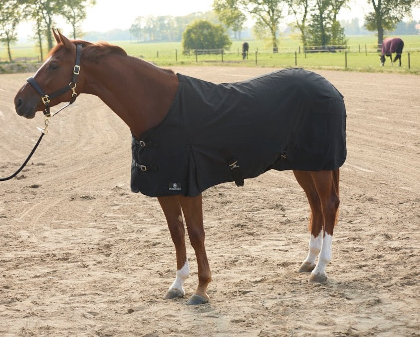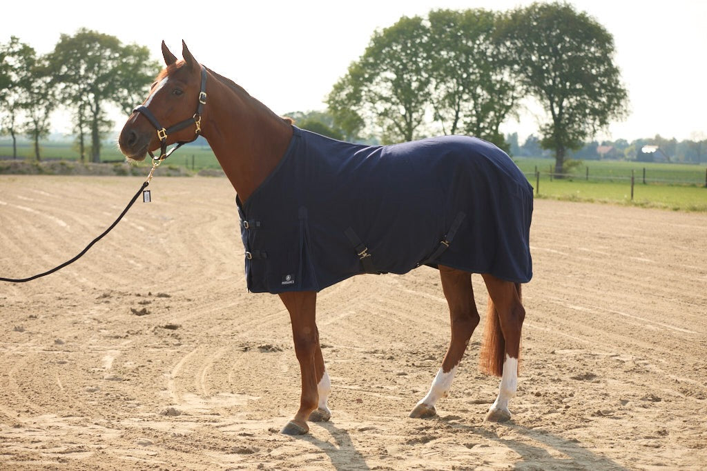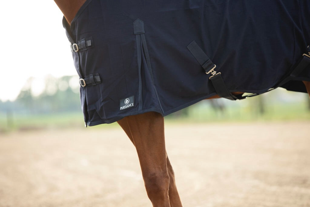 De buikriemen zijn verdoken en afneembaar zodat het zowel op de vrachtwagen als in de paddock gebruikt kan worden. Vooraan heeft dit deken 2 sluitingen. Het is ook voorzien van een afneembare en wasbare plastic staartriem.